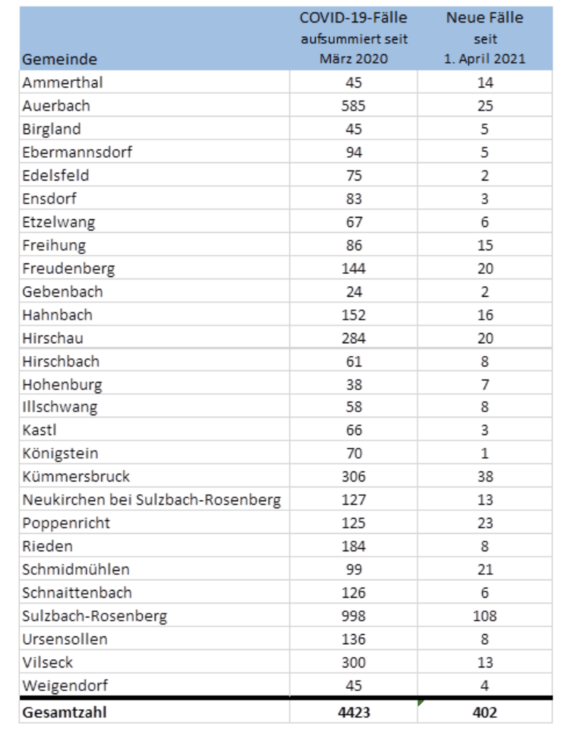 So hat Sulzbach-Rosenberg nicht nur mit 998 bisherigen Fällen die meisten Corona-Infizierten im Landkreis, sondern auch seit dem 1. April 2021 genau 108 neue. Es folgen mit großem Abstand Kümmersbruck (38) und Auerbach (25). Dagegen gab es in Königstein im April nur einen einzigen neuen Fall, nur je zwei in Gebenbach und Edelsfeld sowie drei in Ensdorf und Kastl.