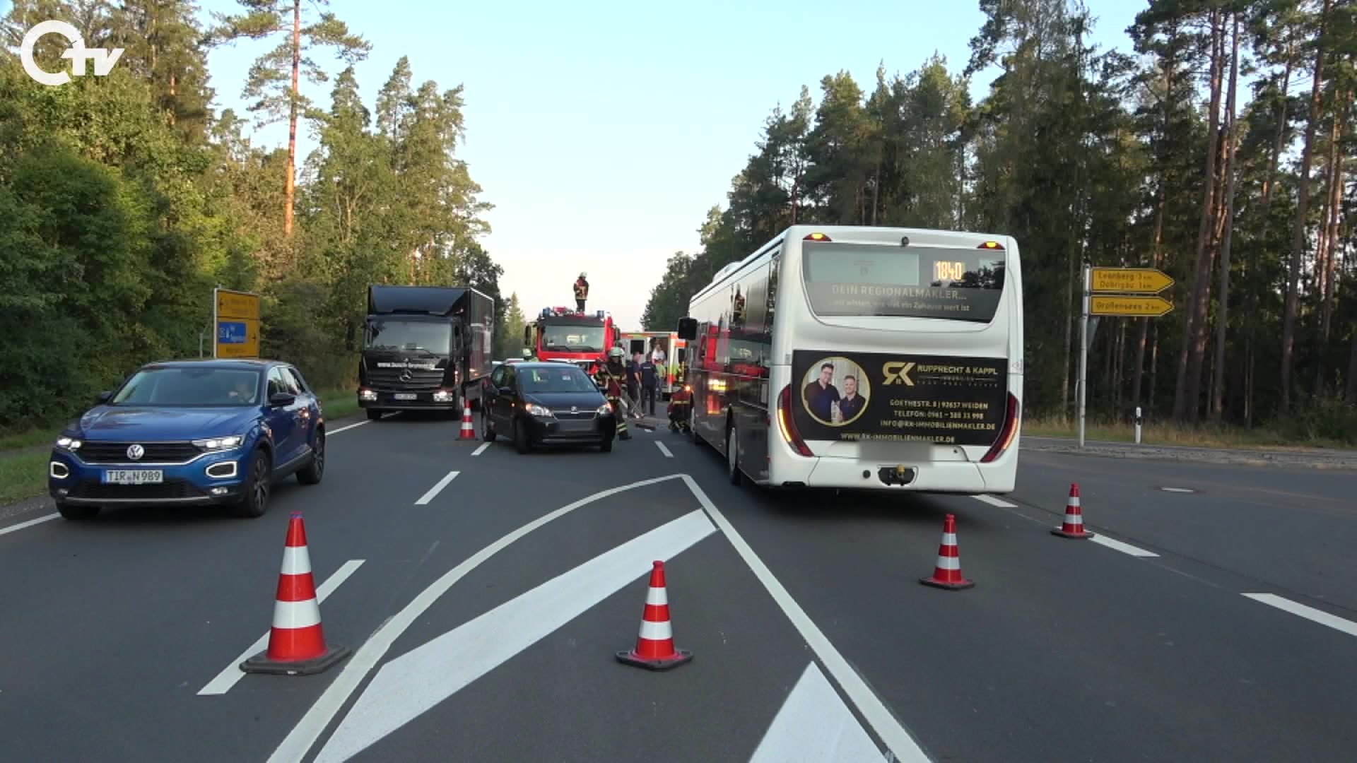 Auf der B15 zwischen Tirschenreuth und Mitterteich bei der Abzweigung Leonberg ist heute Morgen ein Auto mit einem vollbesetzten Schulbus zusammengestoßen. Dabei wurden zwei Schüler im Bus, der Busfahrer sowie zwei Jugendliche in dem PKW leicht verletzt. Laut Angaben der Polizeiinspektion Waldsassen hatte der Bus bereits die Warnblinkanlage eingeschalten, und wollte bei einer Bushaltestelle weitere Kinder einsammeln. Dabei übersah die Fahrerin des Autos den Bus und streifte ihn.