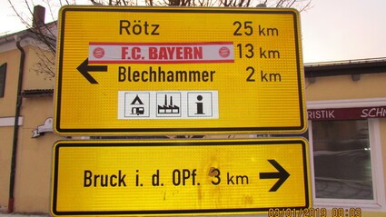 „Stickerkrieg“ in Bodenwöhr?! Vor einiger Zeit wurden Aufkleber des SSV Jahn Regensburg auf Verkehrszeichen in Bodenwöhr geklebt – nun wurden dort Verkehrszeichen mit Fan-Aufklebern des FC Bayern München „verziert“ – eine Straftat.
