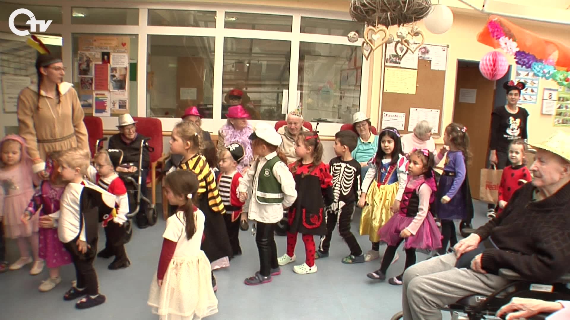 Helau und Alaaf! Bereits seit dem 11.11. vergangenen Jahres läuft die sogenannte „Fünfte Jahreszeit“. Jetzt sind wir am Höhepunkt der Faschingszeit angelangt. An zahlreichen Orten werden heute Faschingsumzüge veranstaltet und gefeiert. Einen eher ungewöhnlichen, aber dennoch freudigen Umzug gab es im Caritas-Altenheim Marienheim in Amberg. Anders als bei einem gewöhnlichen Faschingszug, werfen die Zuschauer den Kindern Süßigkeiten zu. Die Zuschauer waren die Heimsenioren, die dort leben. Kindergarten und Seniorenheim befinden sich im Marienheim unter einem Dach. Deshalb besteht da ohnehin schon eine Verbindung. Die Kinder, die durchs Haus gezogen sind waren natürlich auch verkleidet: Vom Polizist, über das Skelett und den Indianer war alles dabei. Beim einfachen Zug durchs Haus sollte es aber nicht bleiben. Die Kinder haben auch getanzt und gesungen – Natürlich zu den Faschingsklassikern: Das Fliegerlied, Meine Oma fährt im Hühnerstall Motorrad und der Ententanz.
