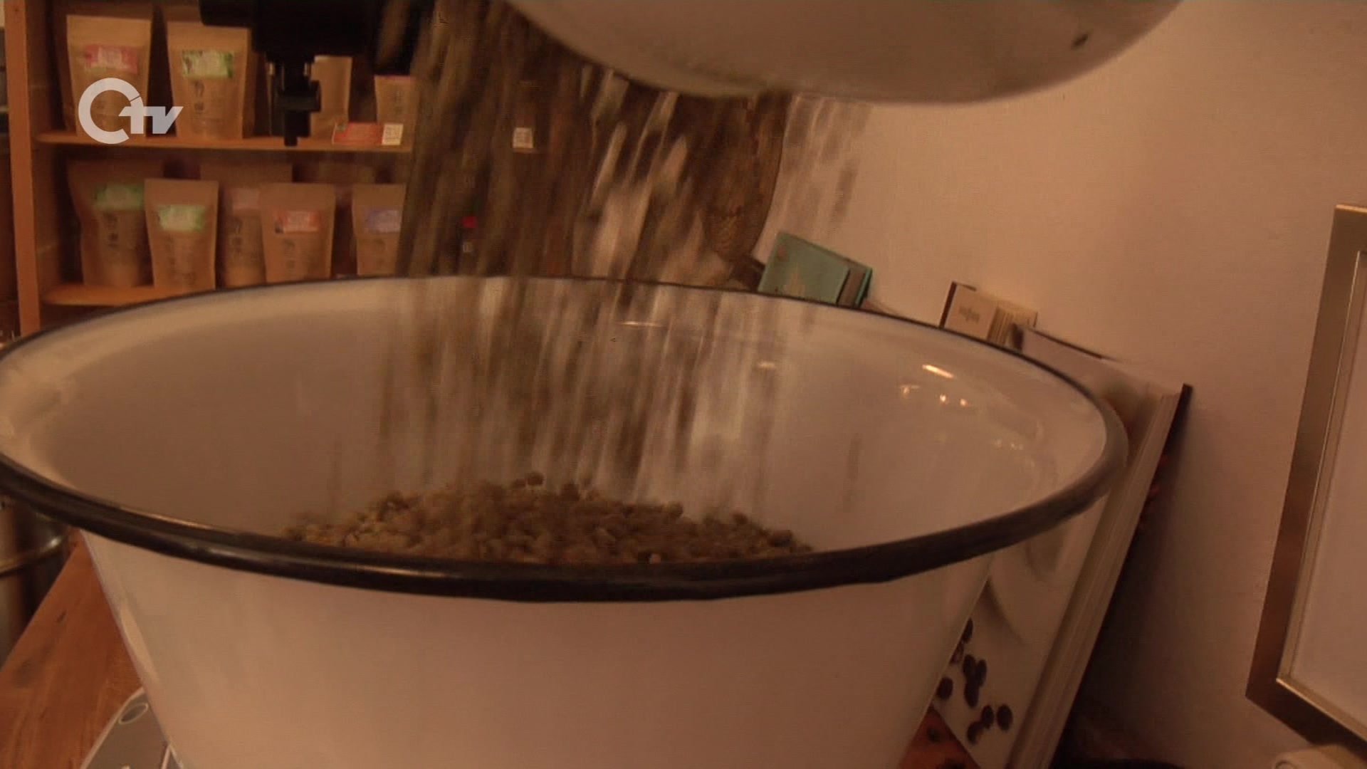 Das Herzstück des Raumes ist der speziell angefertigte Kaffeeröster. Claudia Molter röstet frisch und per Hand. Sechs Kilo Bohnen werden dazu in den Röster gefüllt. Durch den Wasserentzug verlieren die Kaffeebohnen an Gewicht. Bei ungefähr 200 Grad platzen die Rohbohnen auf und vergrößern so ihr Volumen. Ein wichtiger Schritt in der Kaffeeherstellung sei die Langzeittrommelröstung. Hier werden unedle Säuren abgebaut, wodurch der Magen den Kaffee besser verträgt. Nun muss Temperatur der Bohnen schnellstmöglich reguliert werden, um eine sogenannte Nachröstung zu verhindern. Nach circa 20 Minuten ist die Herstellung abgeschlossen und ein aromatischer Kaffeegeruch durchzieht den ganzen Raum.