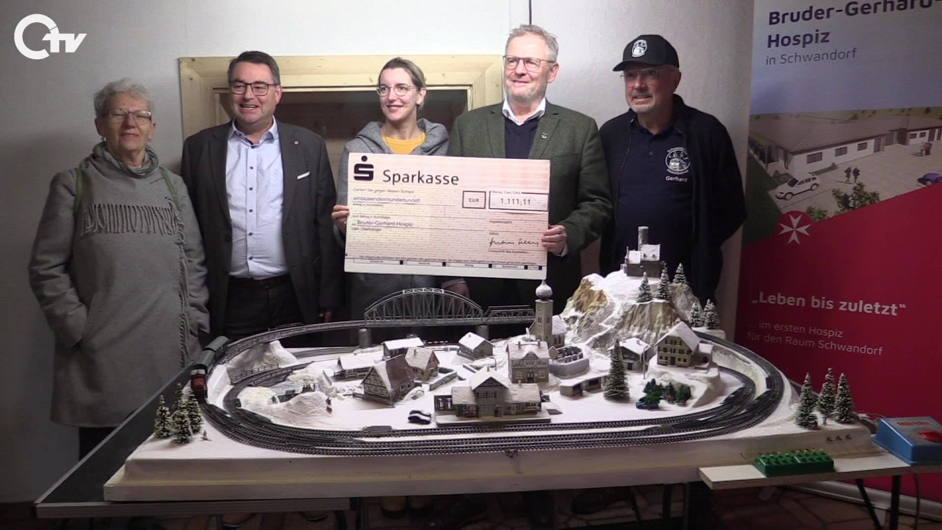 Die Mitglieder der Schwandorfer Modellbahner haben vergangenes Jahr eine Winteranlage gebaut. Diese ist für einen guten Zweck versteigert worden. Käufer ist der Oberbürgermeister von Schwandorf Andreas Feller. Für 1.111,11 Euro hat er die Winteranlage ersteigert. Den Betrag hat der Oberbürgermeister nun an das Bruder-Gerhard-Hospiz übergeben.