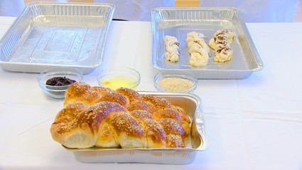 Neben der Challa, dem jüdischen Zopfbrot, haben die Gemeindemitglieder unter anderem Fisch, Hähnchen mit Reis und Kürbis und Zwetschenkuchen zubereitet – selbstverständlich alles koscher, also den Regeln der Tora entsprechend. Das bedeutet: Fleisch und Milch dürfen weder zusammen aufbewahrt noch zubereitet werden. Koschere Säugetiere müssen außerdem Wiederkäuer sein und gespaltene Hufe haben. Schweine dürfen also zum Beispiel nicht verzehrt werden, erfahren die beiden Mandatsträger vom Rabbiner.